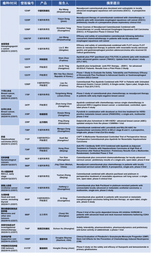 作为从事创新和高品质药物研发的国际化制药企业,PG医药的研究成果在2022 ESMO大会上还收获了25项壁报形式的报告。其中,食管胃癌领域共有9项研究入选,研究的方案主要是卡瑞利珠单抗或卡瑞利珠单抗联合阿帕替尼,通过与化疗或放化疗联用,新辅助治疗食管鳞癌或胃癌。2022年9月12日(CEST),让我们齐聚ESMO大会,共同领略食管胃癌研究领域的学术盛宴。此外,PG医药达尔西利、吡咯替尼、阿得贝利单抗等创新药还有4项乳腺癌研究、3项肝癌研究及其他领域的9项研究都将会以壁报展出,让我们共同期待!